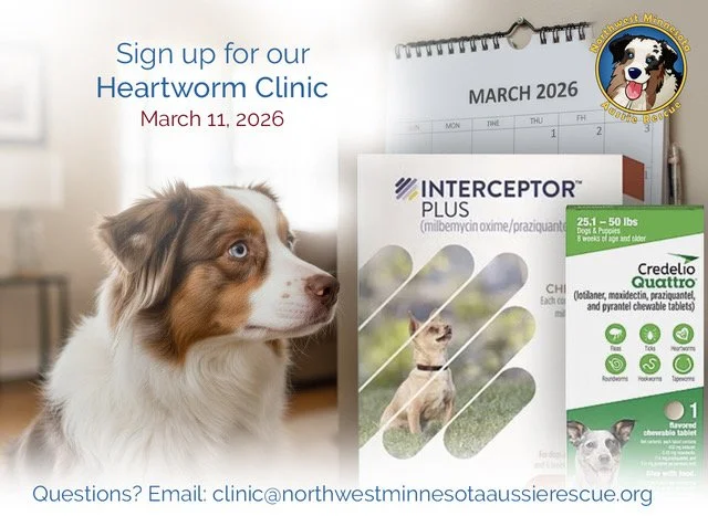 Northwest Minnesota Aussie Rescue is sponsoring a heartworm prevention clinic March 11, 2026 at Valley Creek Road Animal Hospital in Woodbury, MN. It is open to all dogs and all owners. This will be by appointment only and prepayment is required. We will start at noon and will take 3 dogs every 15 minutes. There are no addition fees.